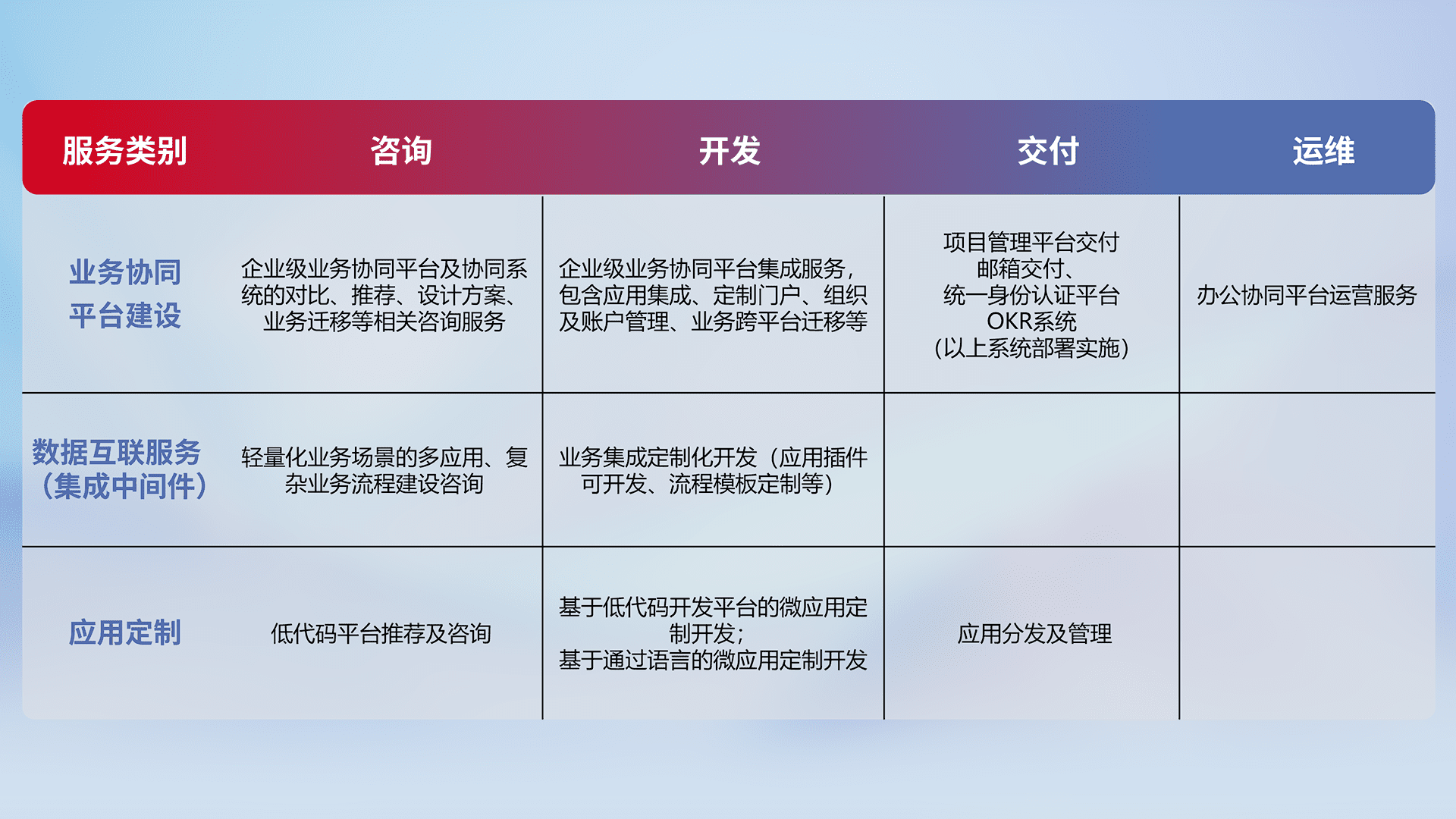 针对钉钉、、企微、、IDaas等平台级产品提供产品的规划、、方案、、、、交付、、、定制化开发等服务,,,,实现如统一协同办公、、、智能客户服务、、、混合会议管理、、、、智能数据查询、、等业务场景,,,实现数字化转型。。
